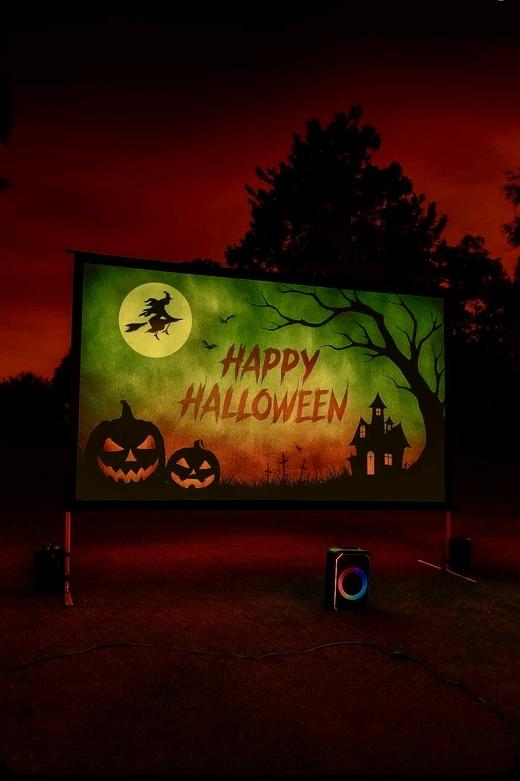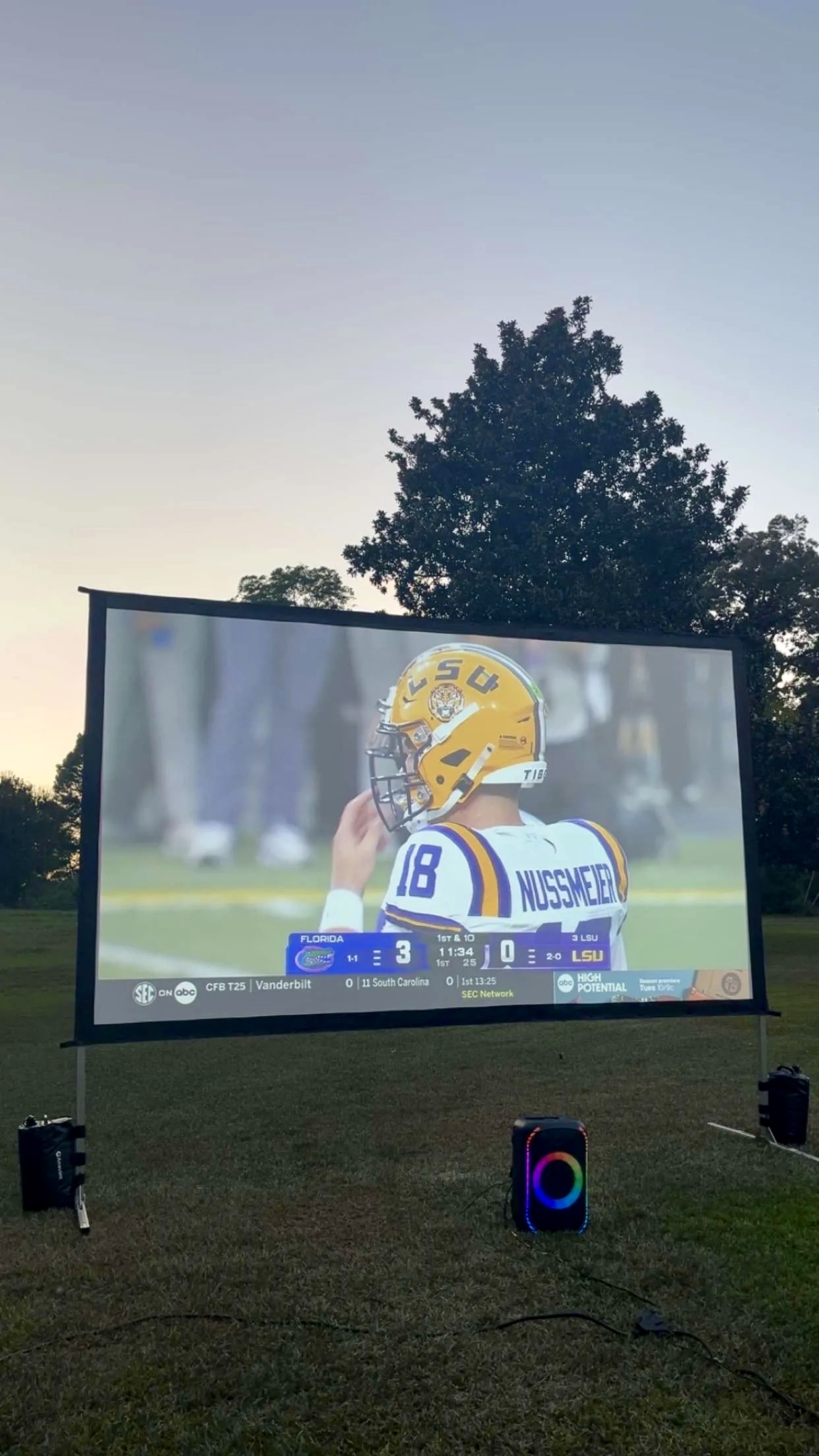 Perfect for backyard parties, football watch nights, weddings, small business gatherings, and community events. This package includes a huge 135” screen paired with a commercial-grade 6400-lumen NEC professional projector along with a medium size speaker. Setup and takedown is done for you! — even if you add extras like string lights or a popcorn machine.
